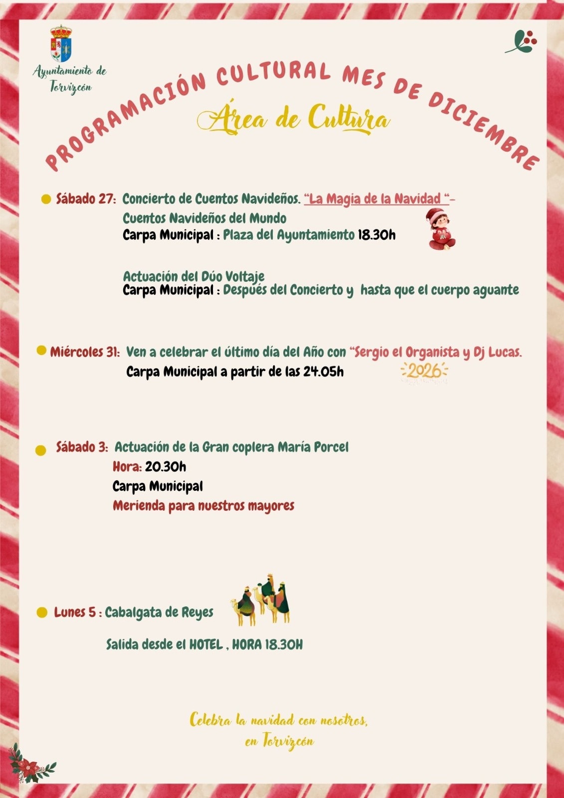 Un mes lleno de actividades para todas las edades, donde la ilusión, la música, el arte y la tradición se unen para disfrutar juntos de la Navidad. teatro , pasacalles para nuestros peques ,encuentros musicales, cine, actuaciones, fiesta de Nochevieja y nuestra Cabalgata de Reyes! Que los niños la esperan con mucha ilusión todo en la carpa municipal (en la plaza del ayuntamiento)y a beber hasta que el cuerpo aguante !!!!os esperamos !!!