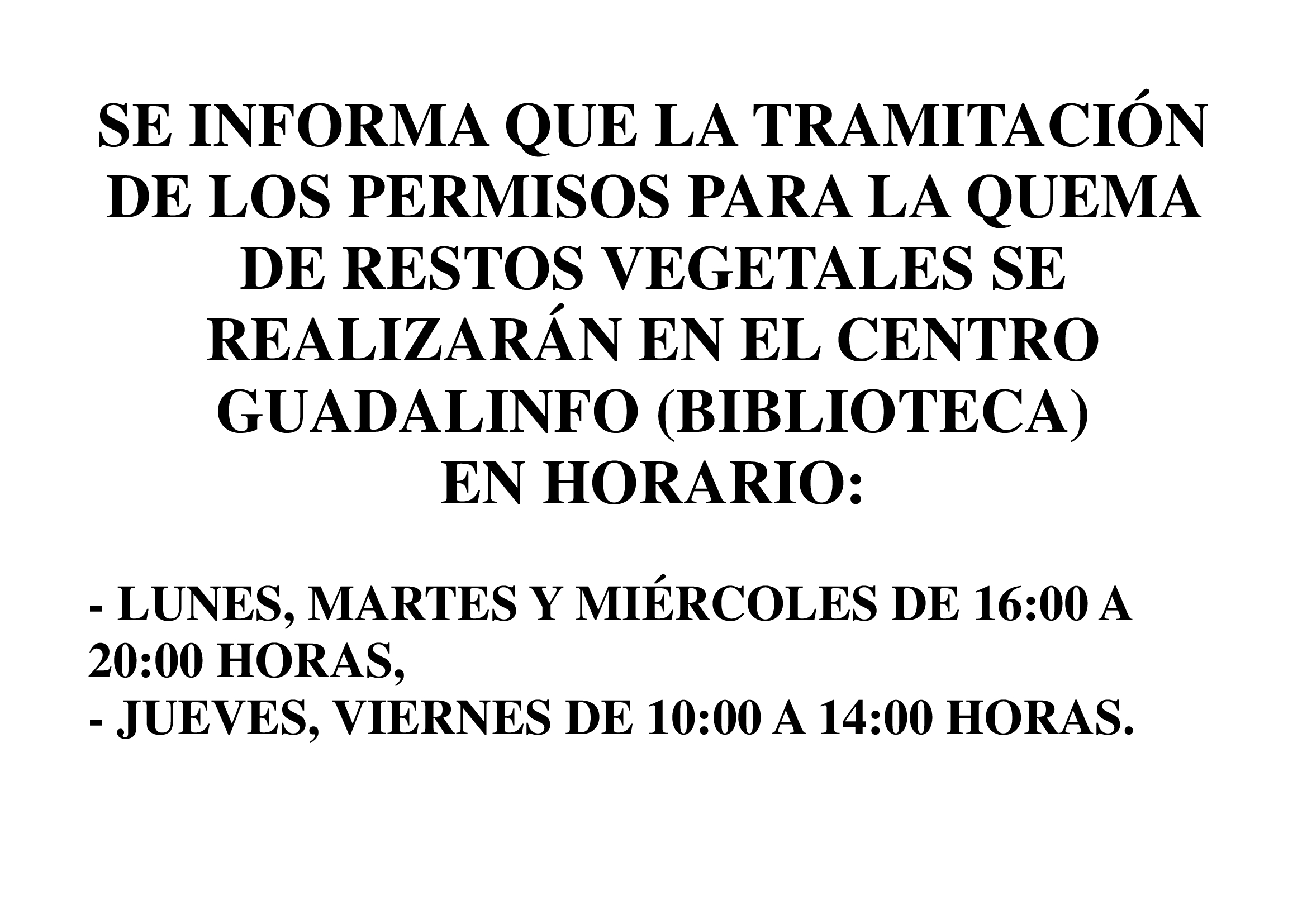 Se informa que la tramitación de los permisos para la quema de restos vegetales se hace en el Punto Vuela(Guadalinfo) de Torvizcón, en horario de: